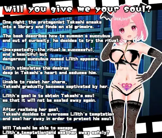 One night, the protagonist Takashi sneaks into a library and finds an old grimoire. The book describes how to summon a succubus, and out of curiosity, he decides to try the ritual. Unexpectedly, the ritual is successful, and a beautiful but dangerous succubus named Lilith appears. Lilith stimulates the desires deep in Takashi’s heart and seduces him. Unable to resist her charm, Takashi gradually becomes captivated by her. Lilith’s goal is to obtain Takashi’s soul so that it will not be sealed away again. After realizing her goal, Takashi decides to overcome Lilith’s temptation and seal her away in order to protect his soul. Will Takashi be able to escape Lilith’s temptation and seal her away safely? Or will his soul belong to Lilith forever? A night of temptation and desire begins.​