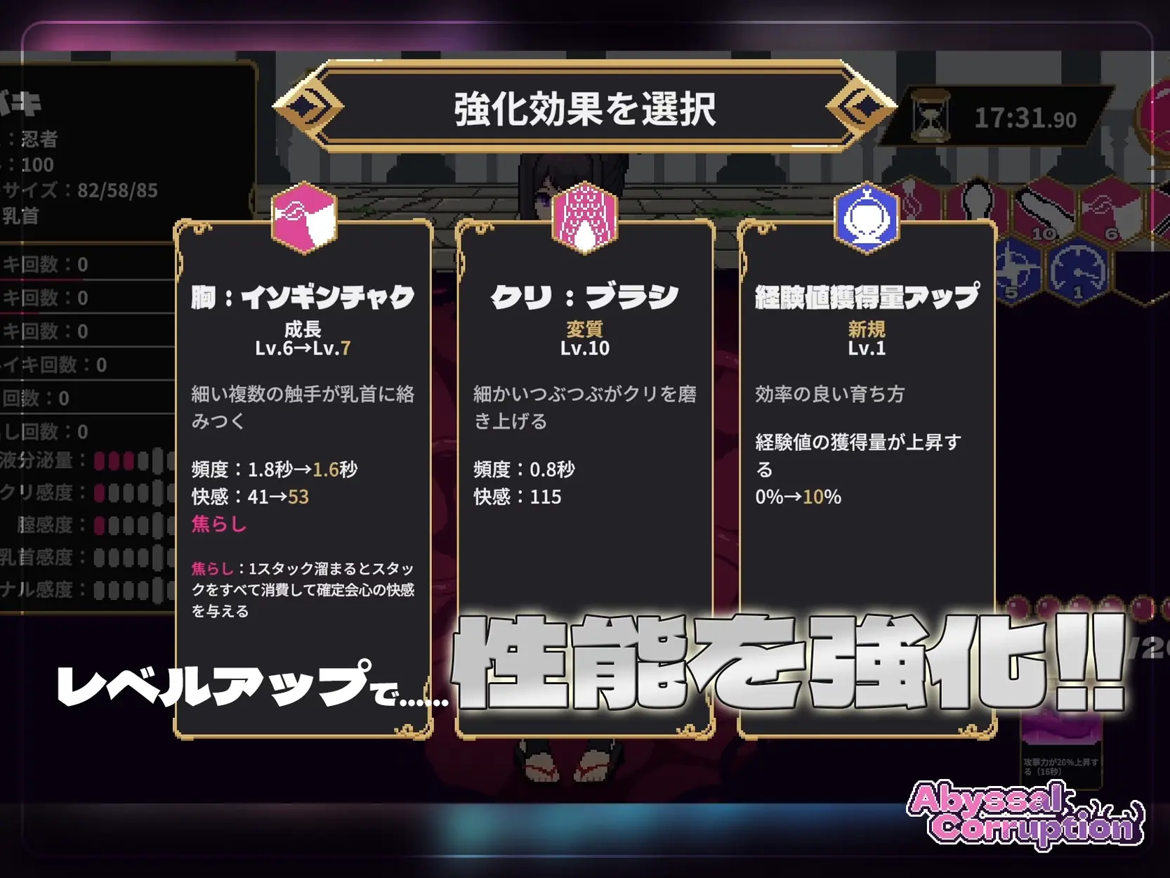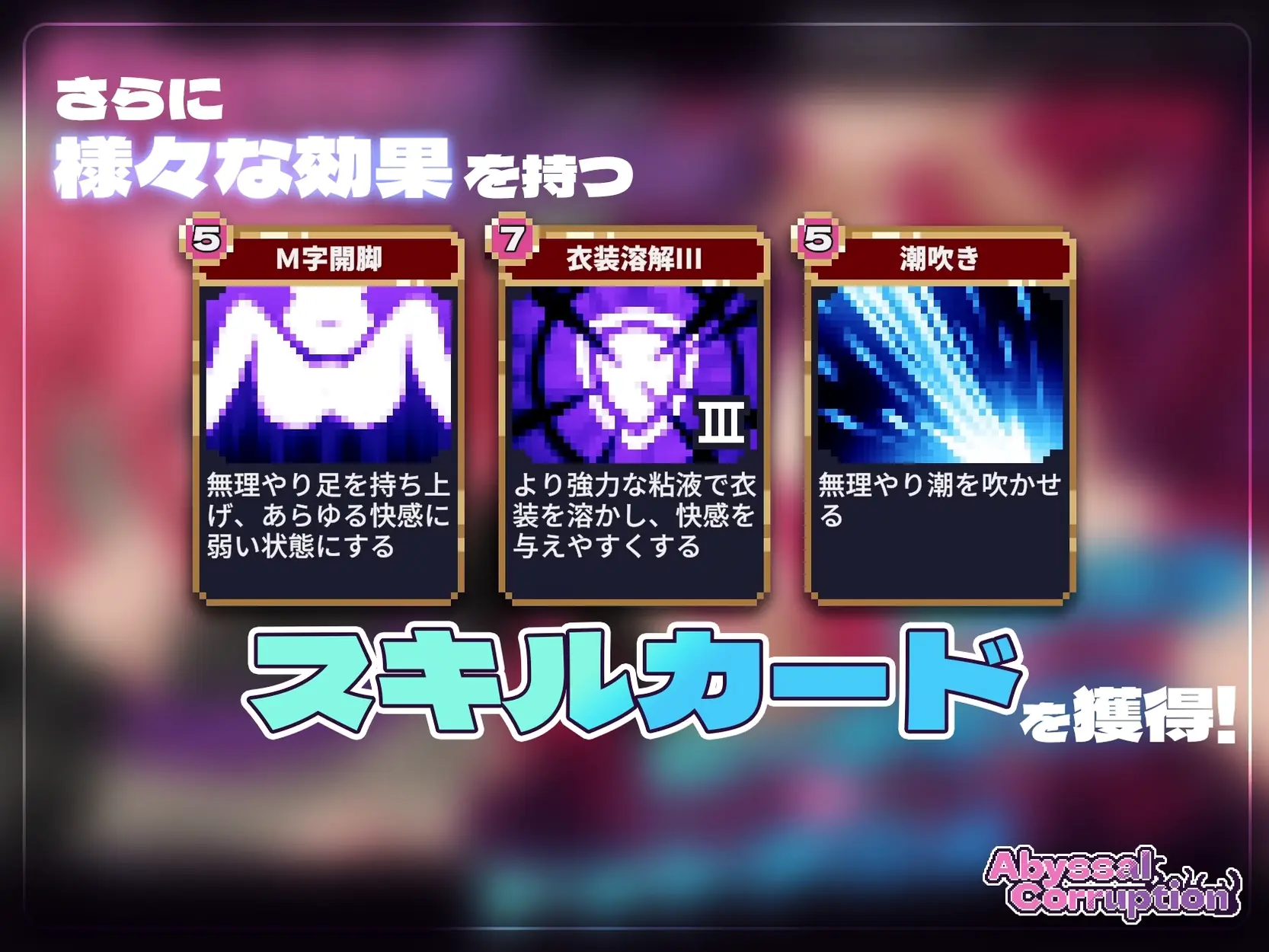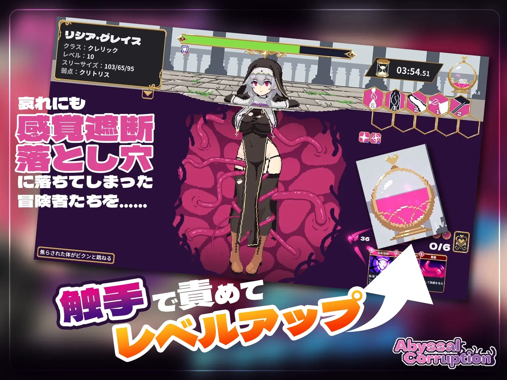 It’s a sensory deprivation pit DPS check game where you defeat adventurers who have fallen into sensory deprivation pitfalls. With cards that change girls’ positions and skills you increase the DPS. Your objective is to do enough arousal damage within the time limit.​