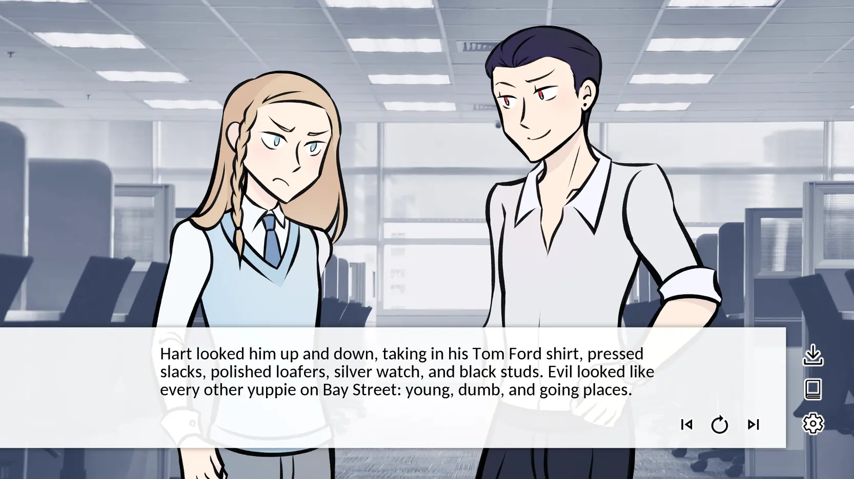 Evil Batlet—full name Eveline, but call him Evil—is a financial associate. Smug, satisfied, and utterly secure in himself, he lives like Hart wishes he could. Evil has a bright future, with a ladder to climb and promotions to look forward to.
