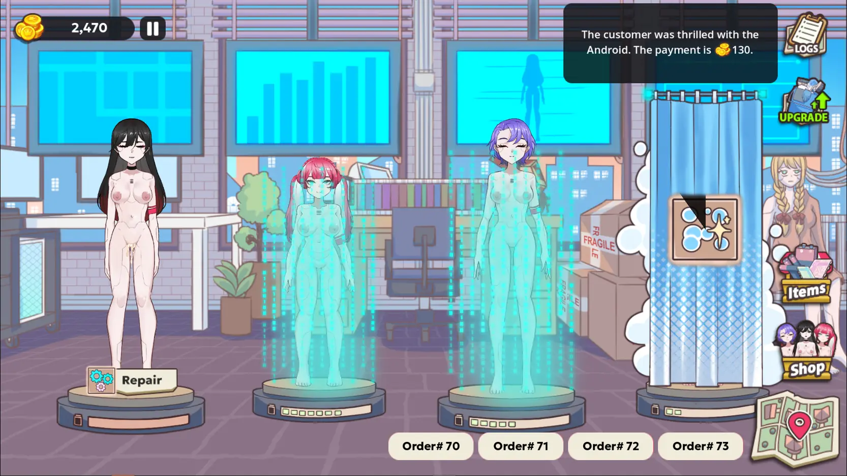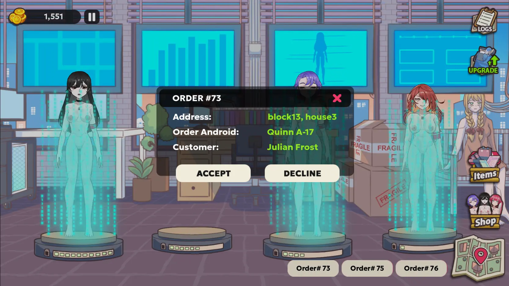 the neon haze of a corporatized future, android companions are the city’s most coveted commodity—and you’re the link that keeps them moving. Each shift begins in the distribution bay, where rows of sealed pods await assignment. Your only mandate: ensure every android reaches her buyer intact and on time. Traffic patterns shift, patrol drones drift, and back-alley shortcuts tempt fate, but profit margins and reputation ride on your choices.