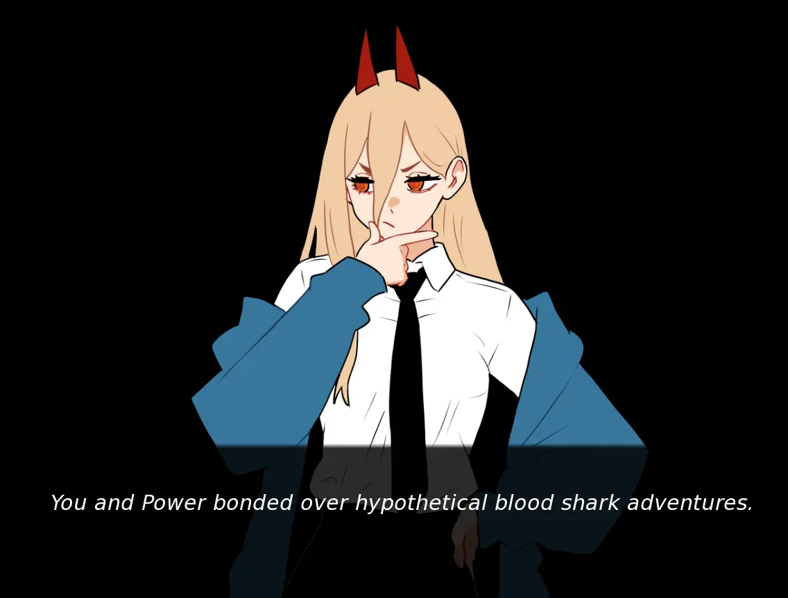 More progress to Power’s Questline. More progress to Himeno’s Questline. Dialogue for Kobeni. Placeholder Eternity Devil for Reze content in 0.4.