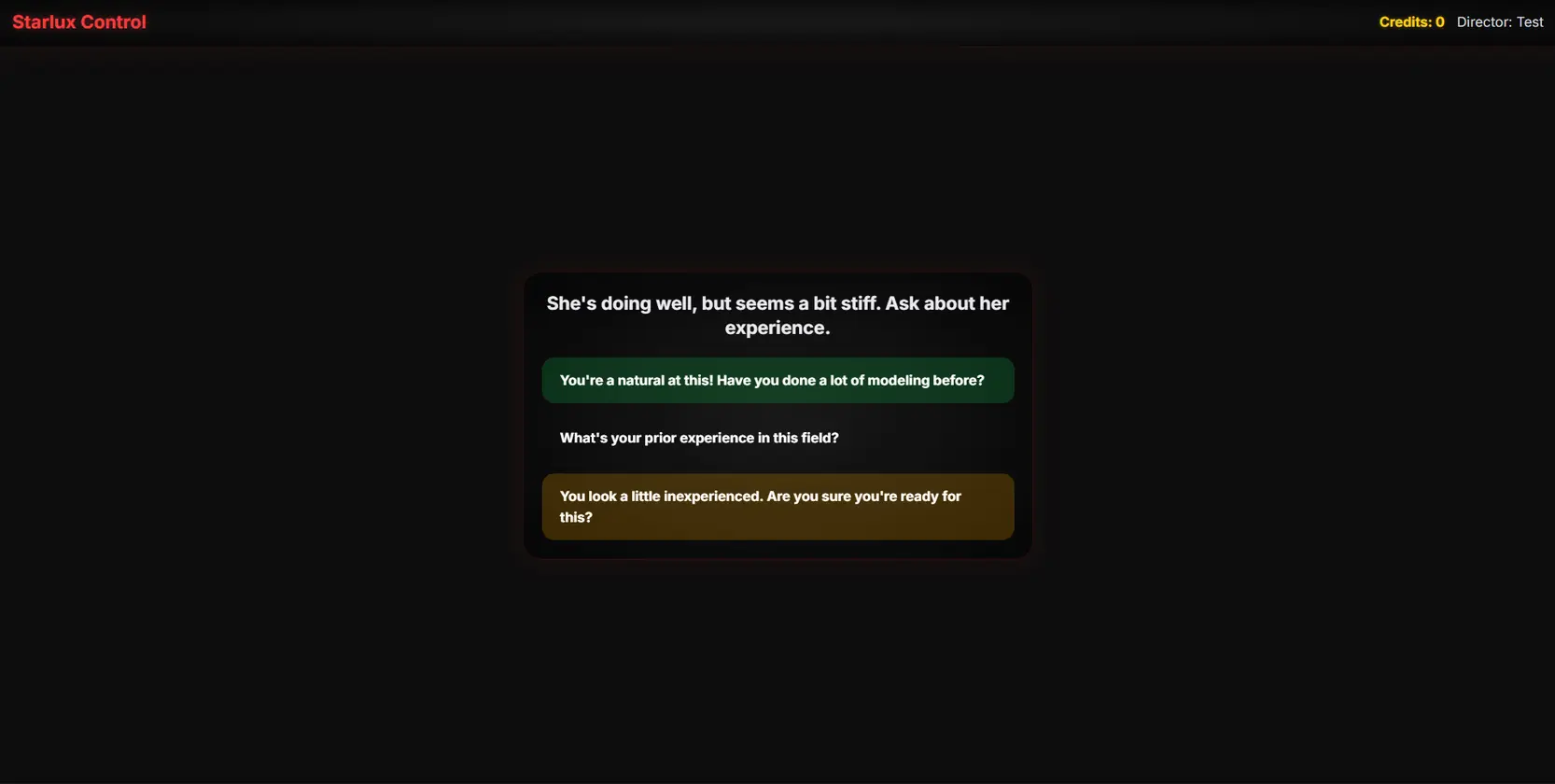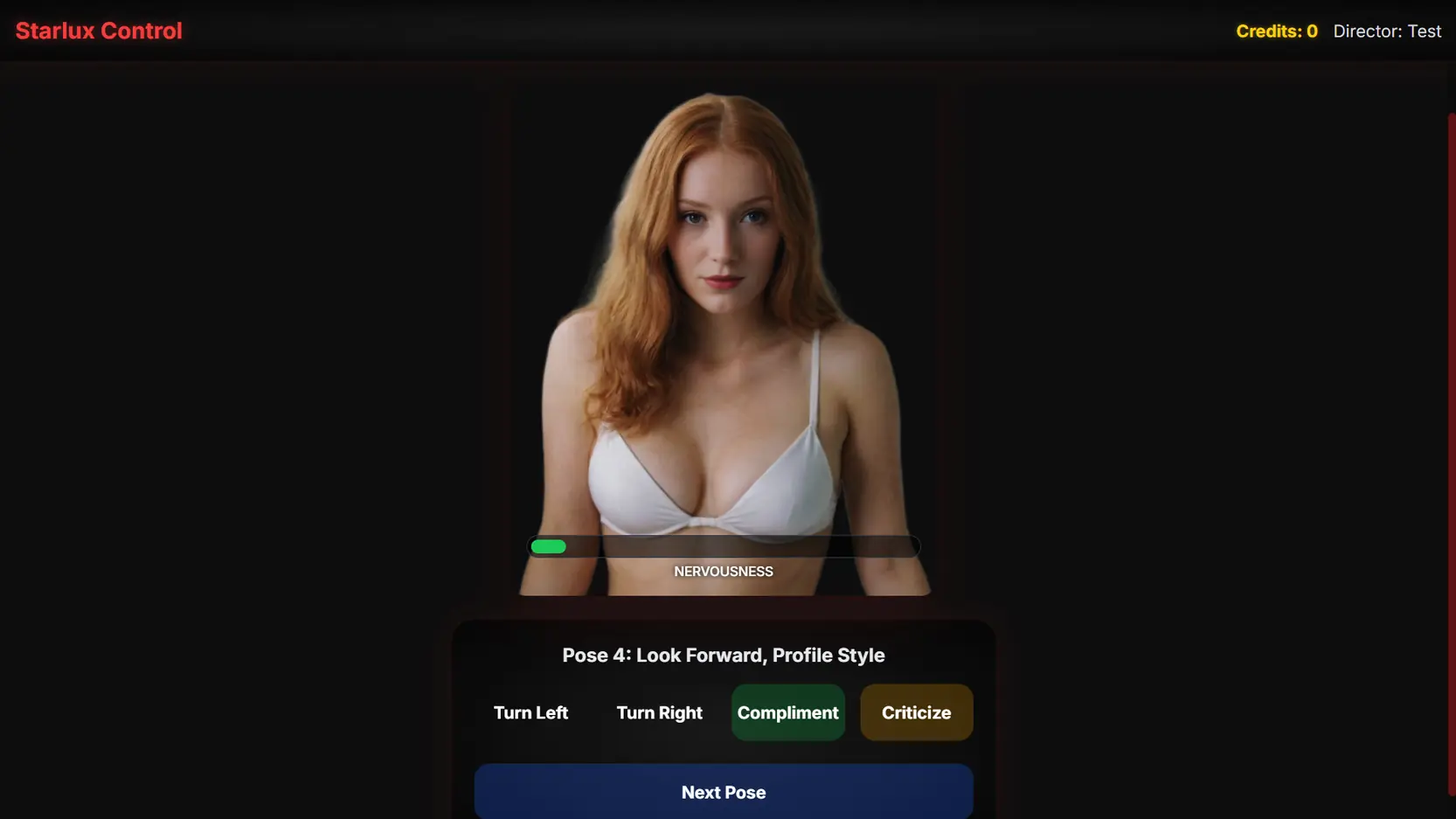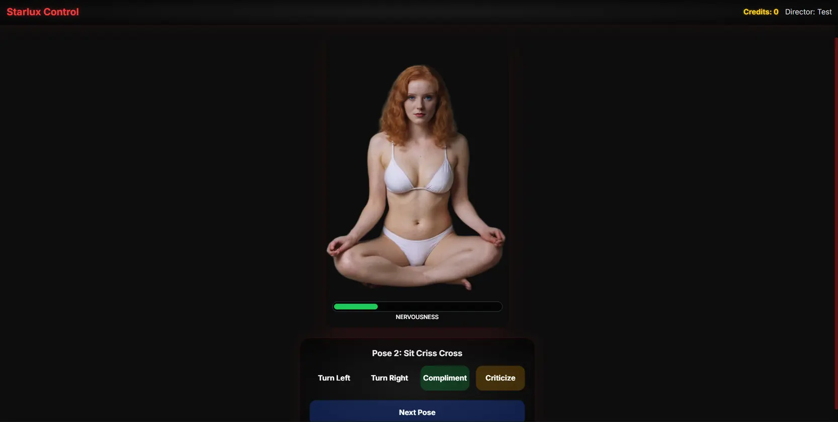Your girlfriend doesn’t have a job, but she’s applying to become a model at Starlux. She doesn’t know you’re the one who’s controlling the interview. You’re the owner of Starlux. Your goal is to get the models to be professional and act right on the job.​