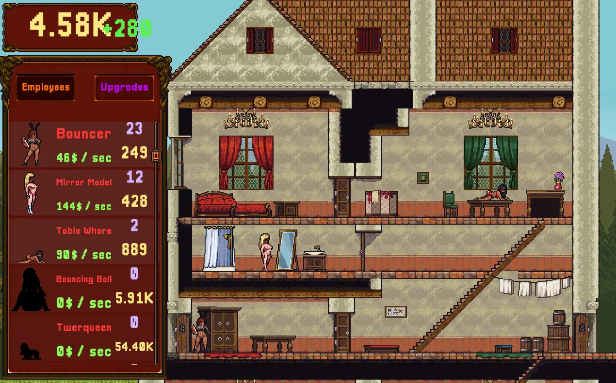 You are the proud owner of a pixel brothel. Run it well and idle away! Your employees work so you can sit back relax and watch their shenanigans.​