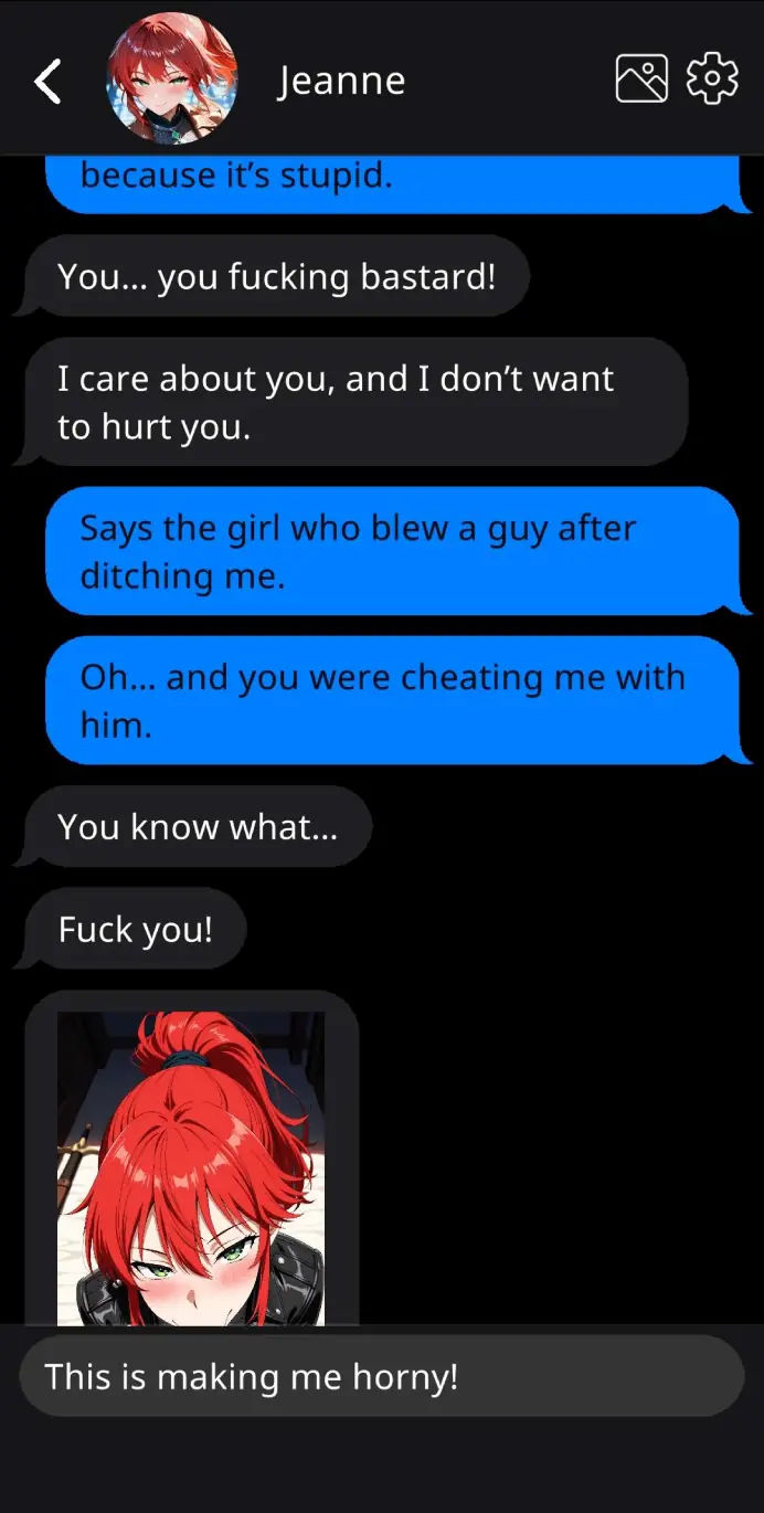 This is the first entry in the Saga of the Im/Mortal Cuck! I lived for 500 years due to a blessing given by the Gods. For most of that time I was a cuck, saving the world from threats. After 5 centuries, I found a girl who’s worth losing my immortality. This is my tale… the tale of the Im/Mortal Cuck! Im/Mortal Cuck is a chat-mobile simulation game that tells the tale of an Immortal hero who is a cuck. The story portrays him, people around him, the comedy, thrill and dangers that can occur in a modern urban fantasy setting. This game has NTR content that cannot be evaded. For future updates, this might change, but for now, it is not the case. Thank you for your time and feedback!​