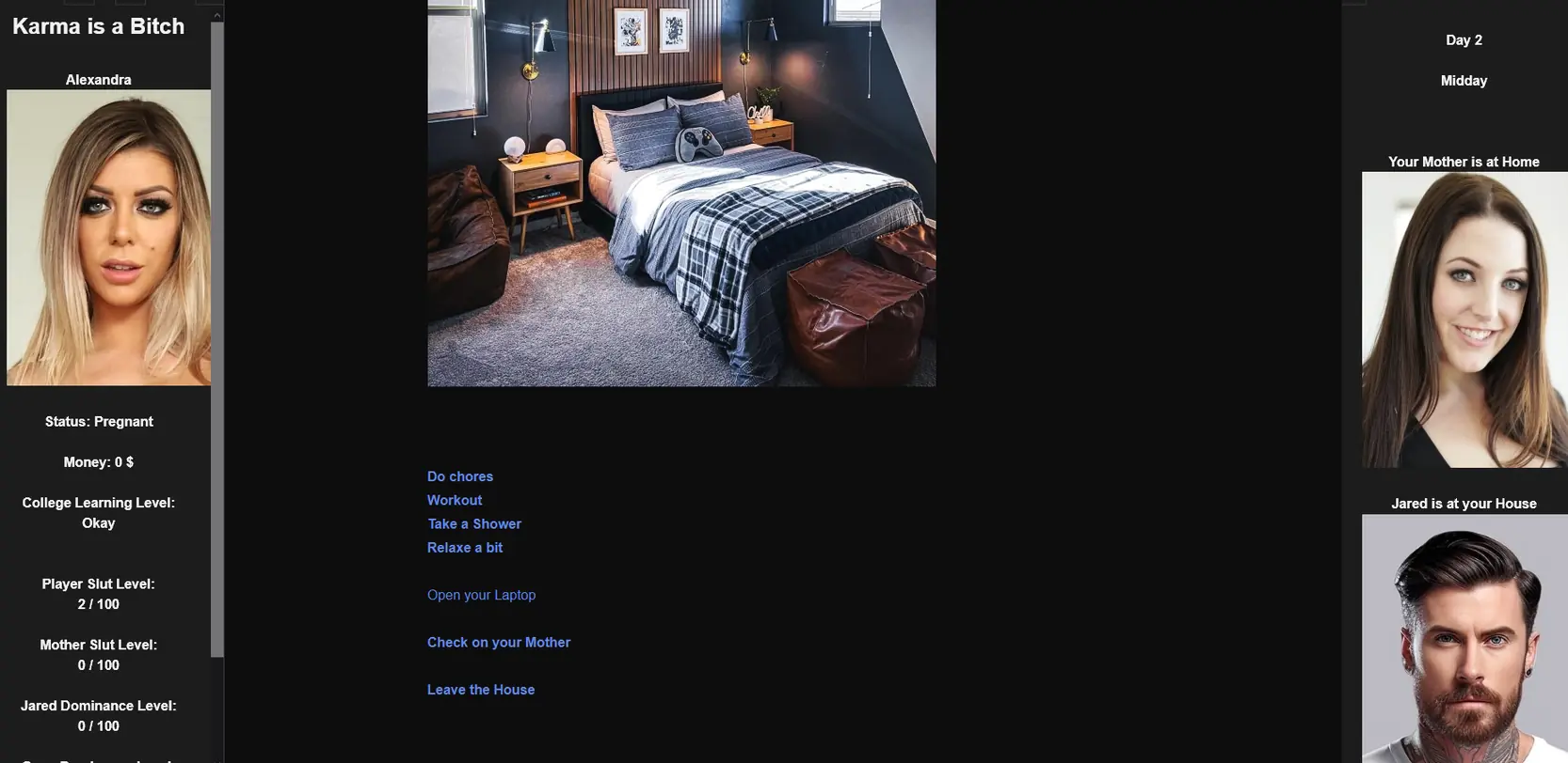 “Karma is a Bitch” is a (in my terms ) small transformation-themed game. The protagonist is more or less involuntarily transformed into a promiscuous lady (guess who?!) and has to endure this for thirty days while balancing various difficulties. The endings vary depending on what happens during those days. Have fun trying it out.