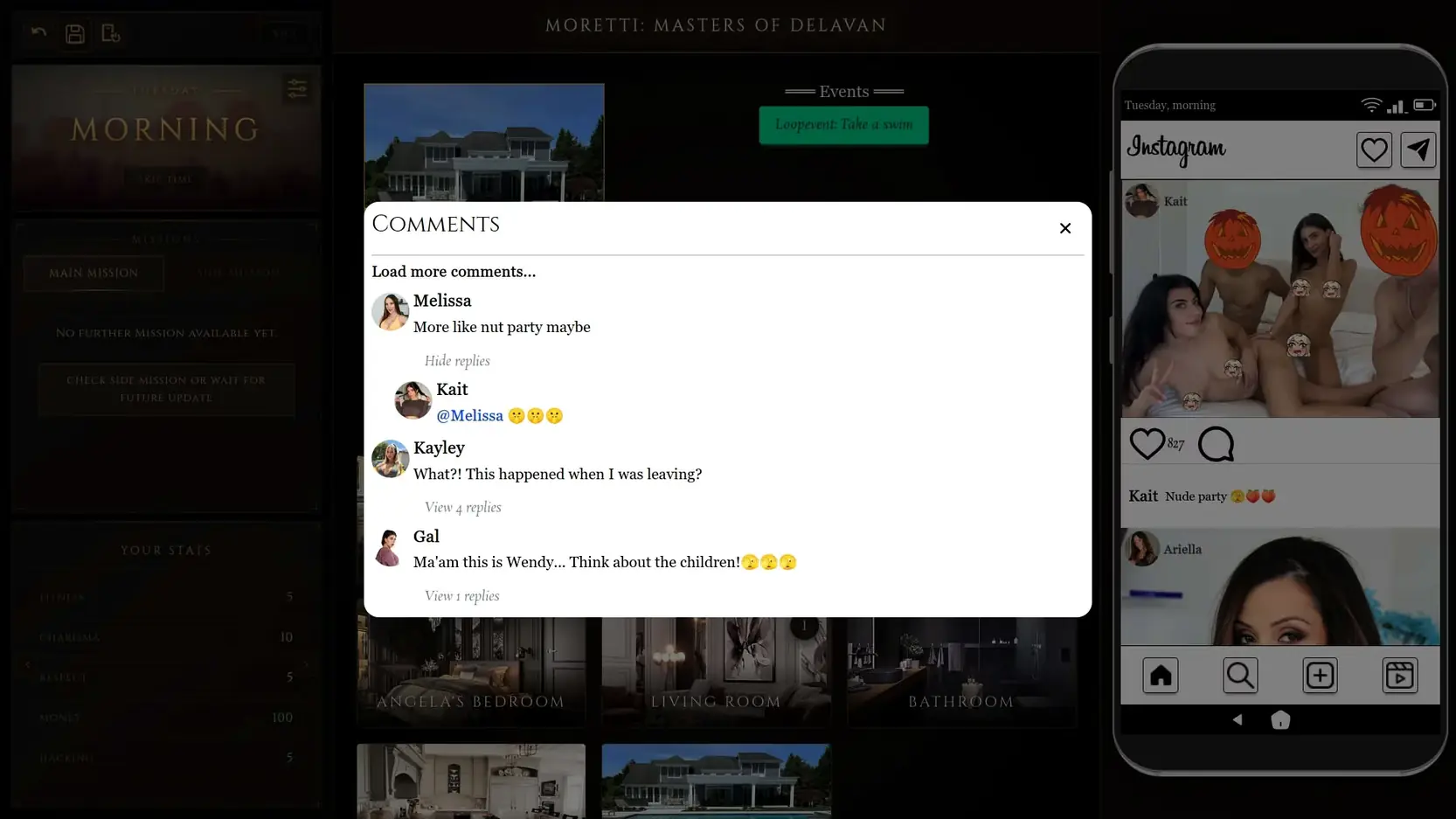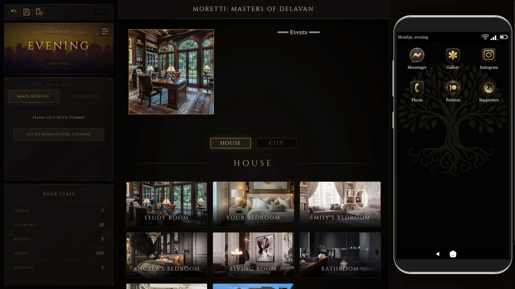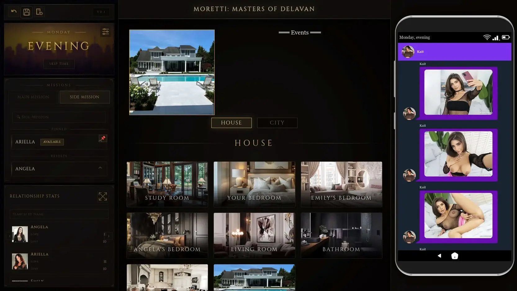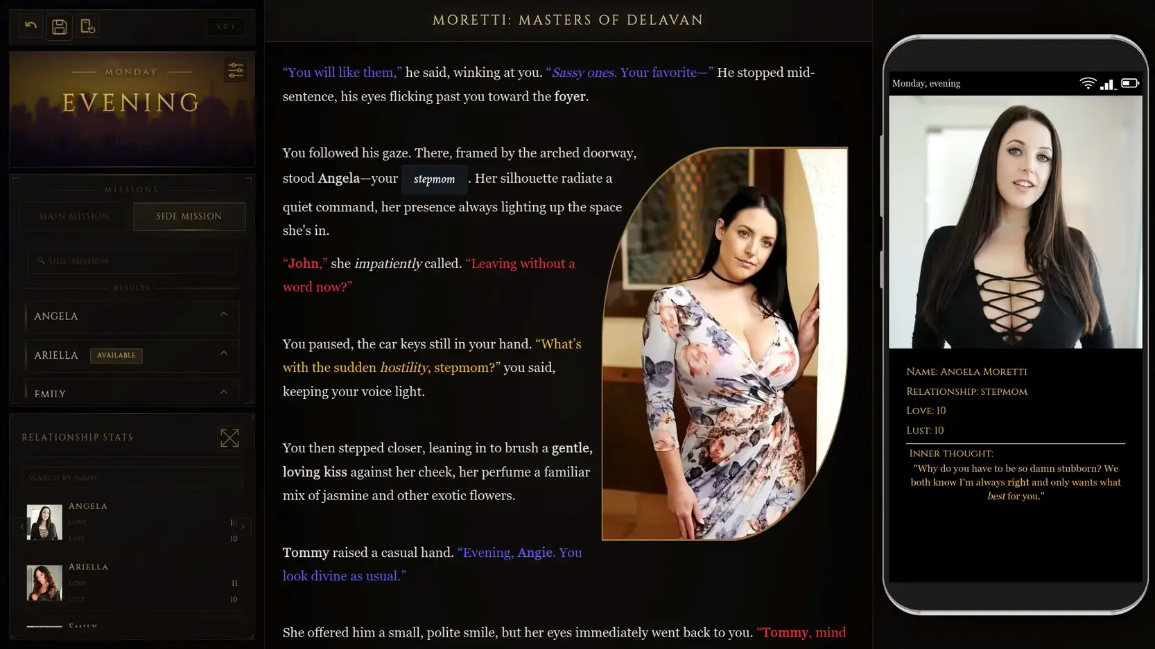 Play as [Your name] Moretti, a third generation and eldest son from the Moretti crime family in a fictional megacity called Delavan. The game is planned to be included a little bit of everything common to be found on male adventure erotica, like slice of life, harem building romance, drama to the darker elements like Crime, master servant relationship etc.​