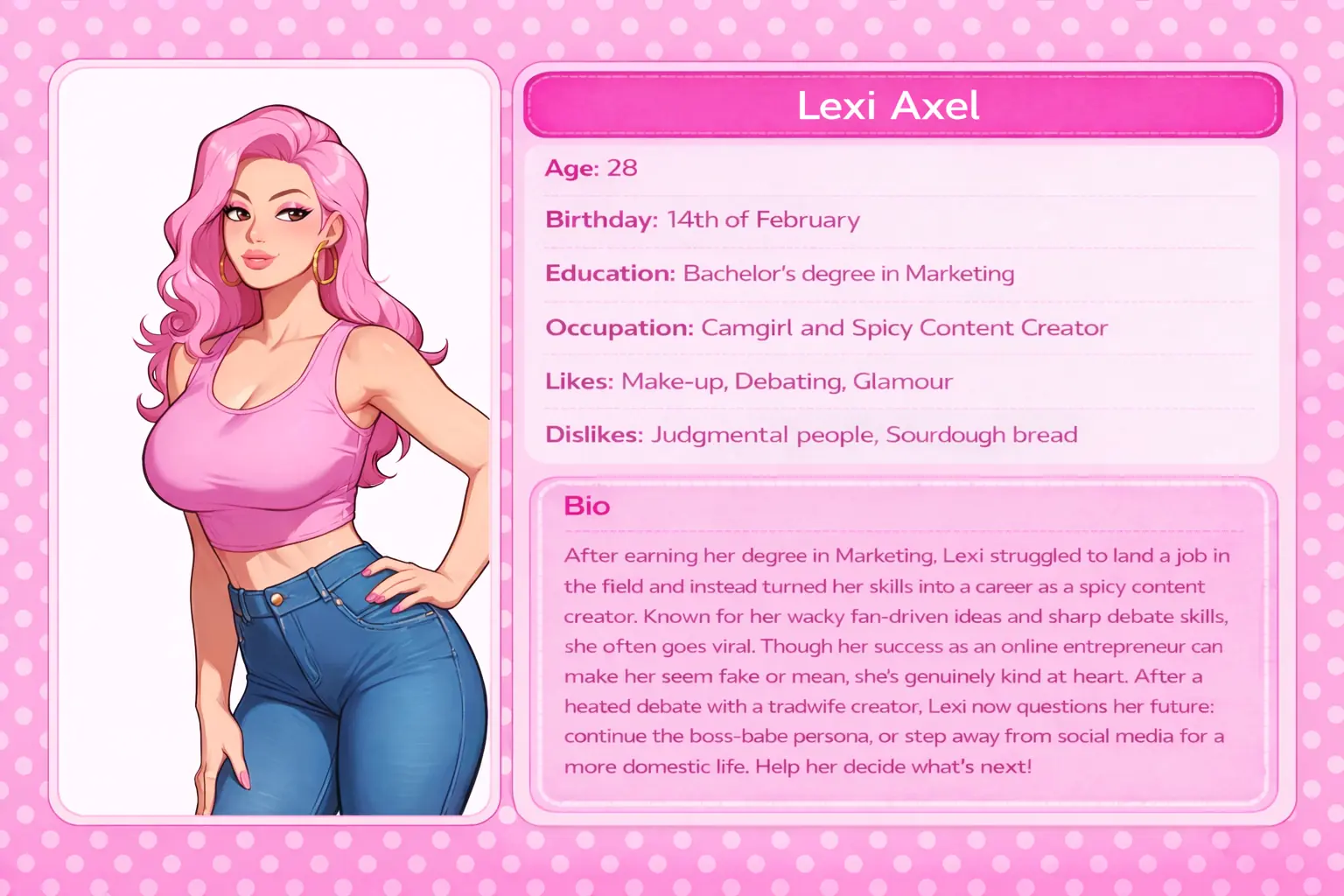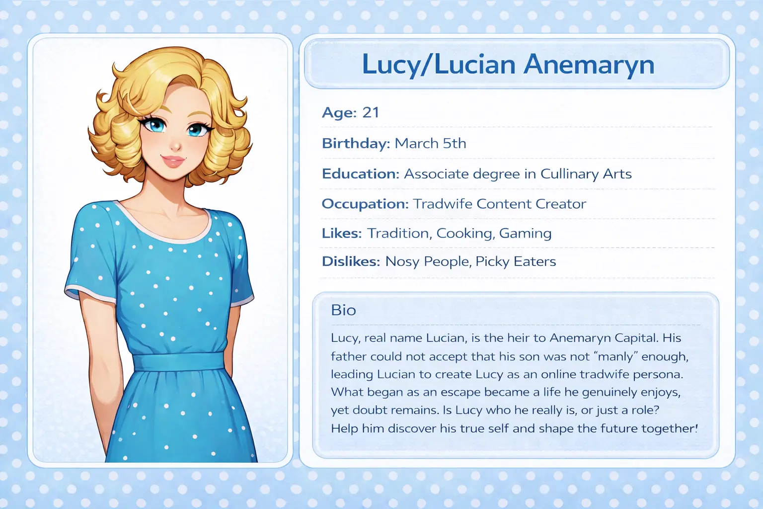 Lucy seems like the perfect tradwife: 1950s dresses, vintage hairstyles, and a passion for cooking straight out of a 50s cookbook. But after the wedding, you uncover a surprising secret… your tradwife is actually a femboy?! Will it remain a marriage for appearance or grow into true love? Your choices will decide!​