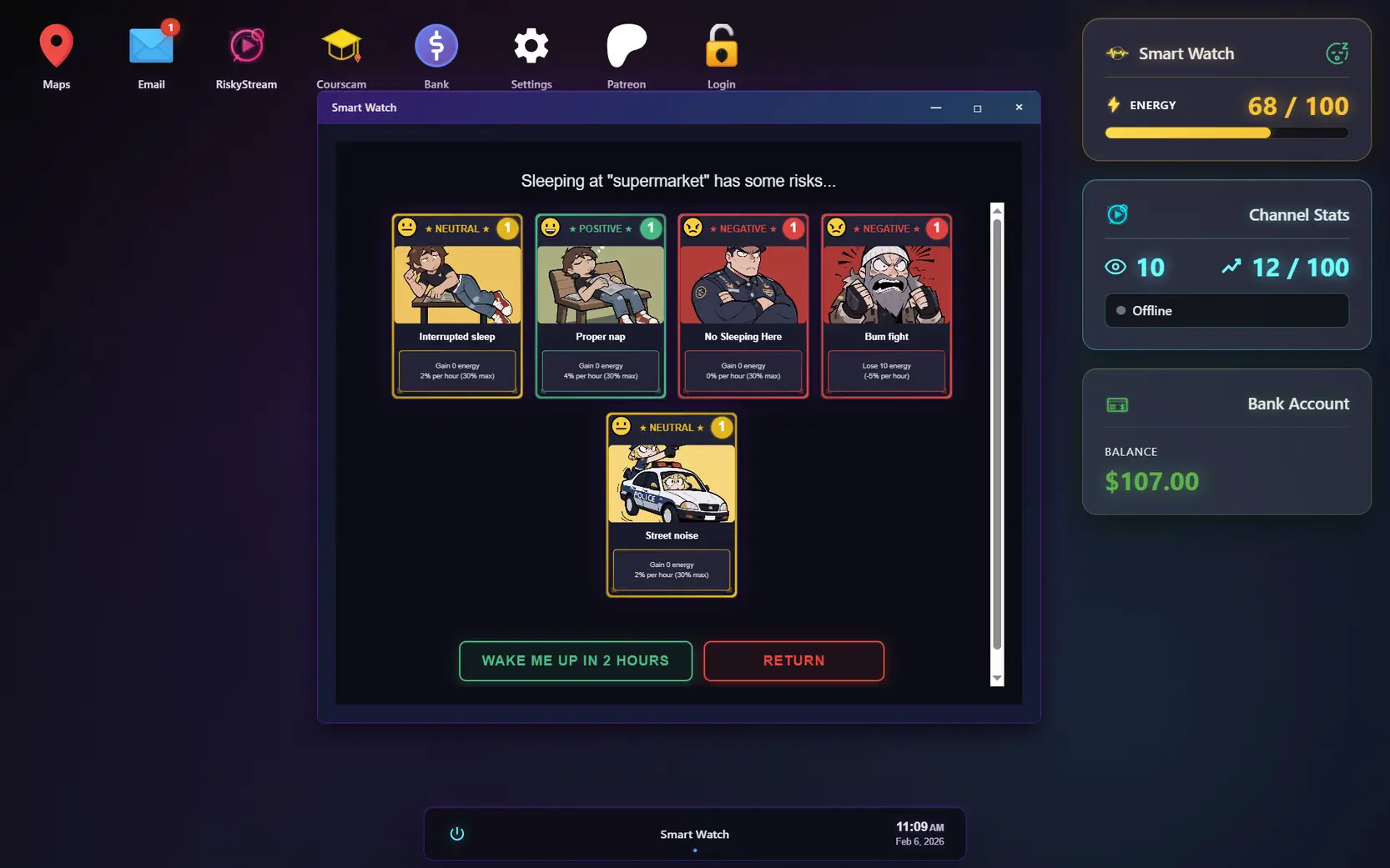 You start out as a no-name beginner streamer flirting with girls in public places, streaming every interaction live to an audience hungry for drama. The game plays as a card-based system where every move is a gamble. Build hype, manage risk, and decide when to push your luck — play it too safe and nothing happens, push too far and the stream crashes.