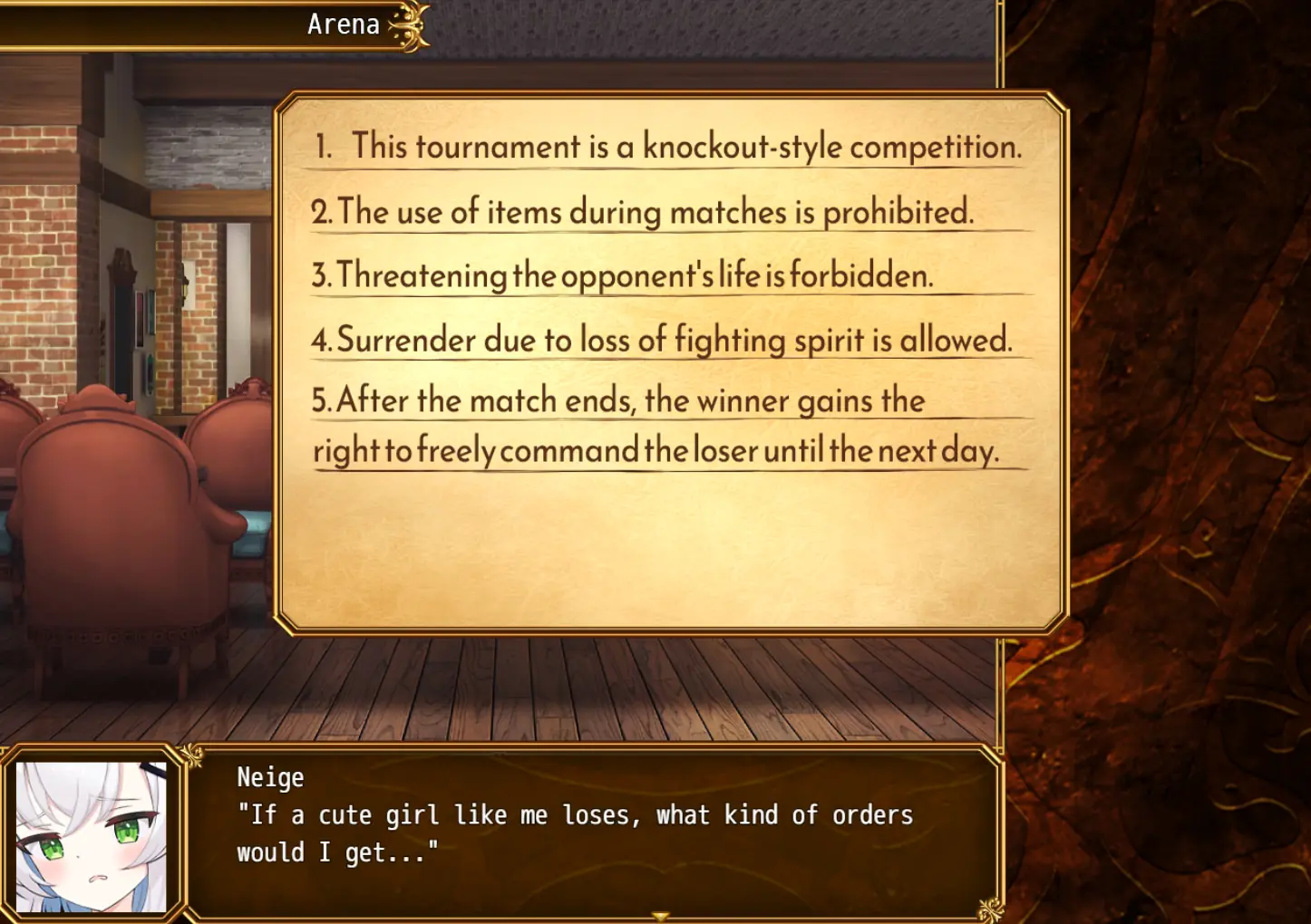 Adventurer Yuni and her lively companion Neige find themselves short on coin, with little choice but to enter the grand martial arts tournament, the Eqttish Arena.