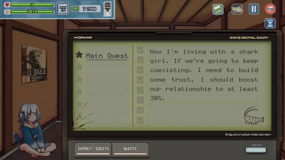 This is a nonlinear visual novel with an open world and life-sim/management elements: explore the island, get the hospital back on its feet, upgrade your home, earn money, and—if you dare—try to build a life with the unpredictable guest with the shark tail. Your choices, dialogue tone, and progression directly change scenes, available options, and even the story’s pace.​