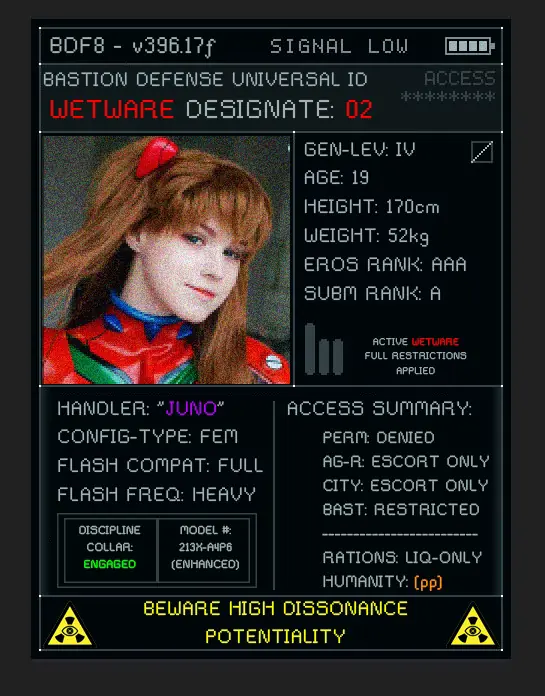 Mind-flashed and locked into their Wetsuits, the submissive few capable of piloting an Instrument are humanity’s last defense against a Dissonant song that has washed over the world. Settle into your restraints, slot in, and try not to desync– the defense of the city is your duty, and failure demands punishment… or worse.​