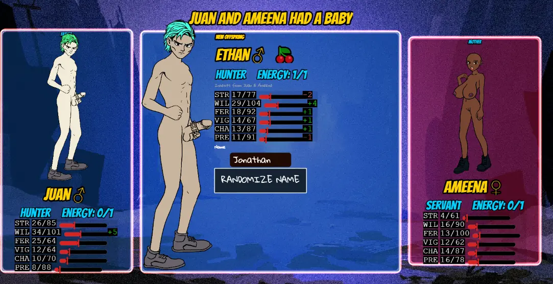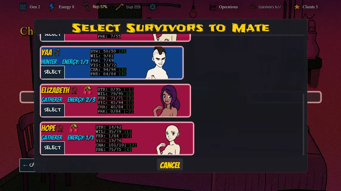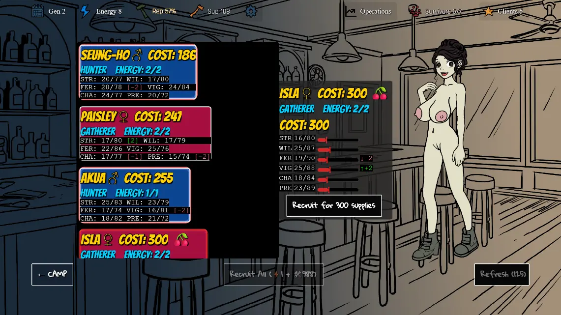 In a world trying to bounce back from collapse, survival isn’t just about food and shelter anymore… it’s about keeping humanity going. In The Load Off, you manage a camp of survivors, pair them to meet bounty demands, and guide the rise of factions that all have their own ideas about what rebuilding really means. Each generation brings new faces, traits, and choices. Your pairings shape genetics, morale, and the fate of civilization itself. It’s strategy with a playful twist—where every decision can change the world (and the bedroom).​