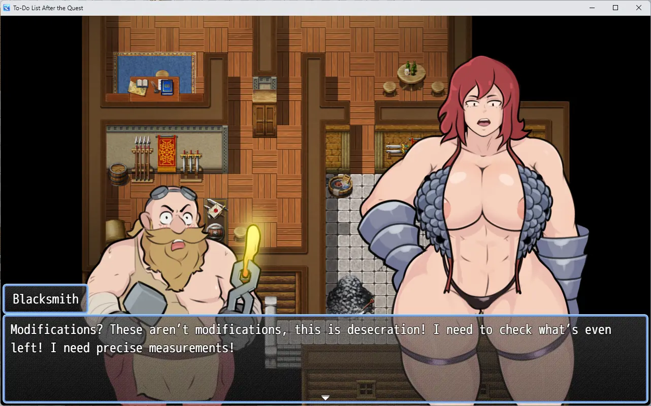The main heroine of the game is a huge, muscular barbarian girl (a parody of classic fantasy, D&D, The Lord of the Rings, and so on). She has already saved the world, and according to the plan, she will now be looking for something to do in her free time. I don’t want to make a typical corruption game — the heroine won’t get into trouble or hopeless situations, won’t lose her powers, won’t become a victim of circumstances, but she also won’t be an over-the-top dominator who constantly proves how strong, cool, and independent she is. The idea is to make a hentai comedy in the dumbest possible fantasy setting, parodying everything it can.​