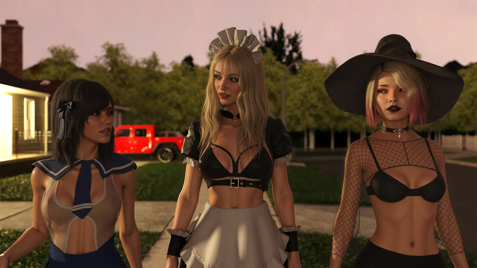 Three 18+ girls ditch the candy and hunt for trouble—one married Batman, one porch, zero regrets. Costumes drop, lines blur, and the night ends sticky.